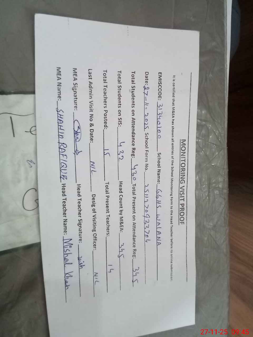 | Attendance Register | Head Teacher | MEA with School | Visit Proof |