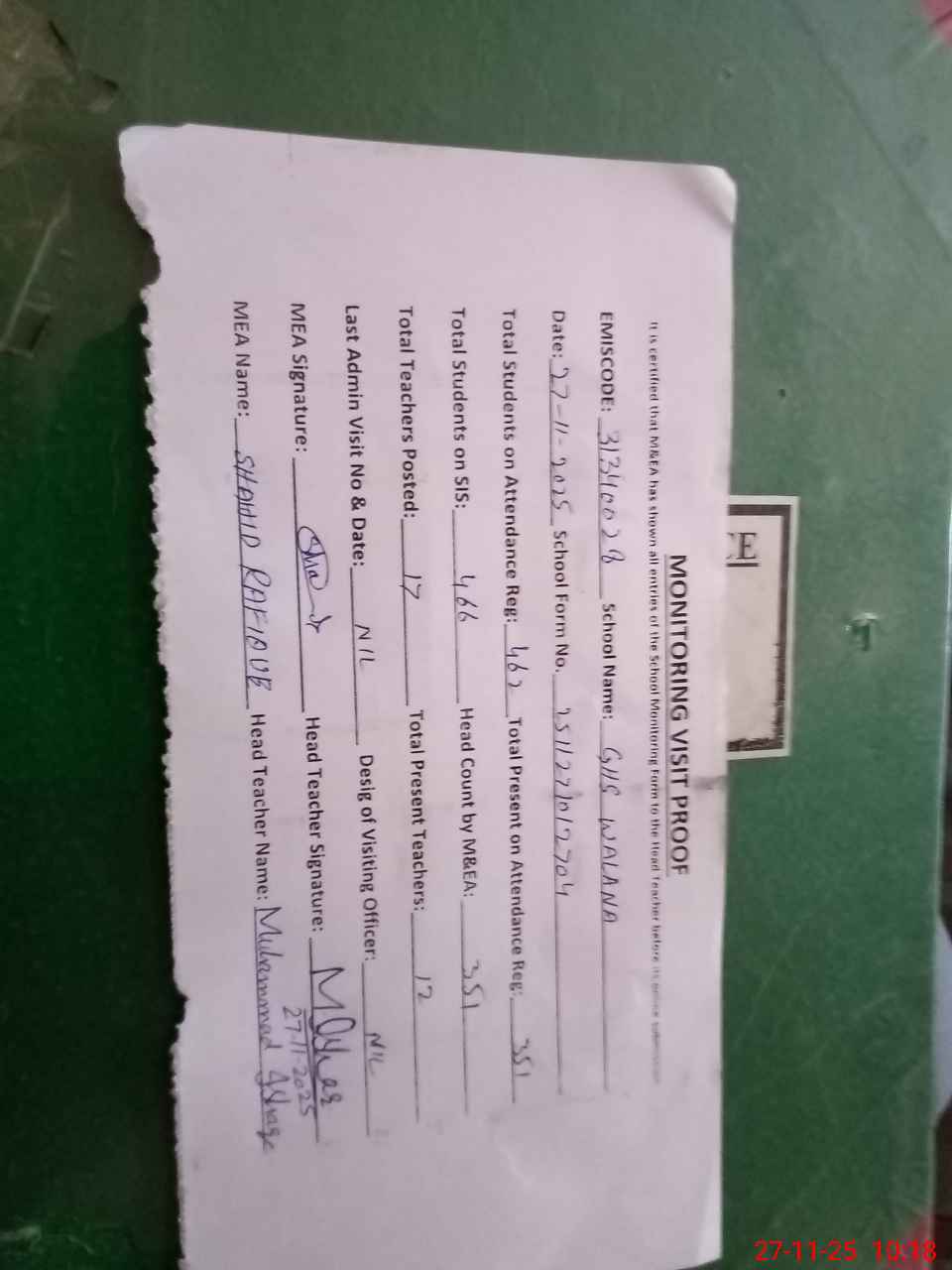 | Attendance Register | Head Teacher | MEA with School | Visit Proof |