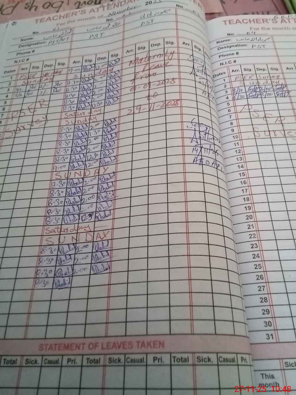 | Leave | Duty | Absent | Maternity | Medical | Ex- Pak |