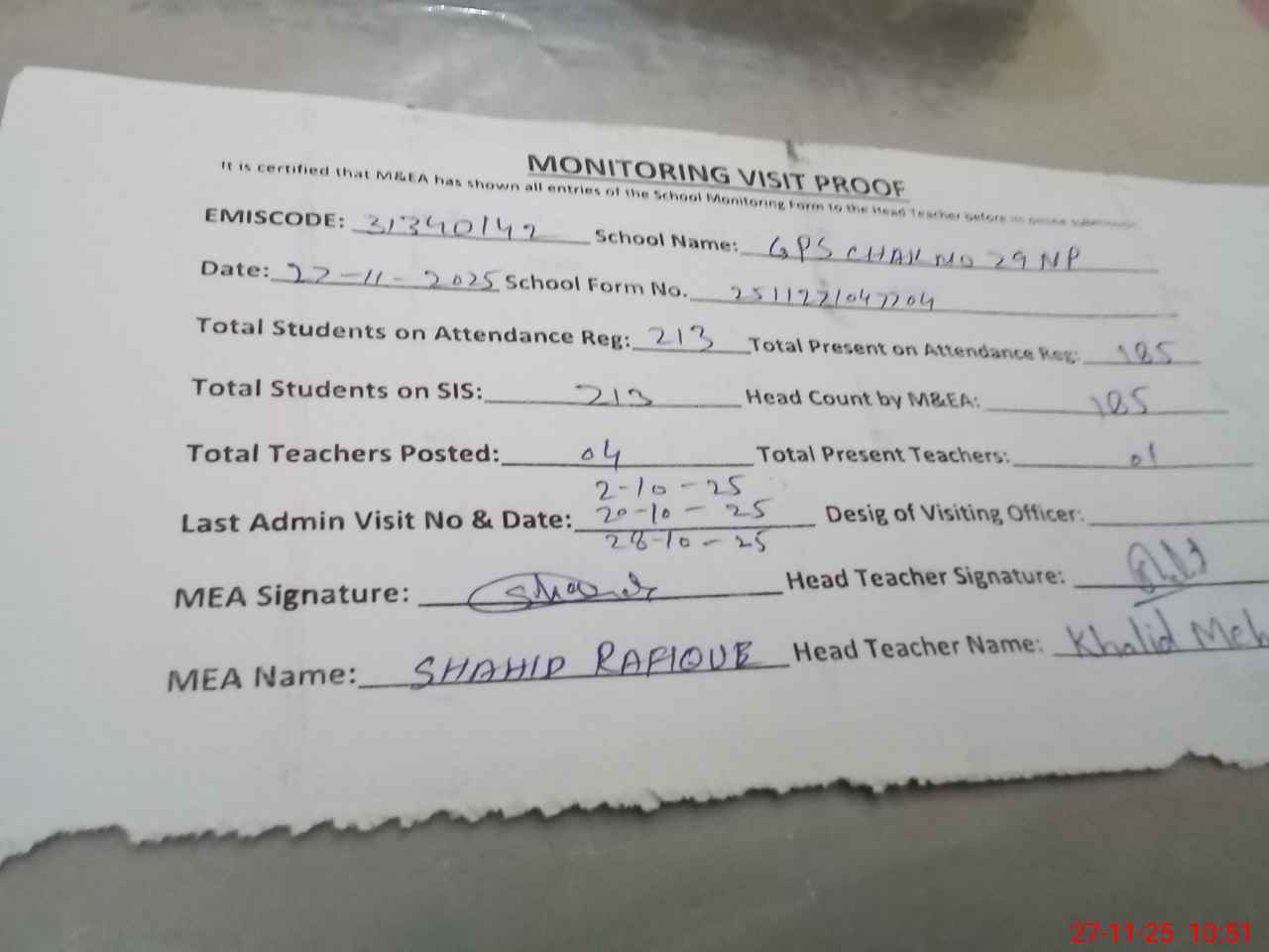 | Attendance Register | Head Teacher | MEA with School | Visit Proof |