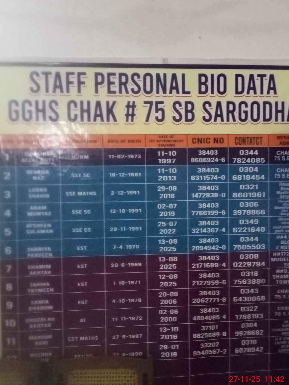 | EMIS Code: 38420081 | Name of School: GGHS CHAK NO.75 SB | |||