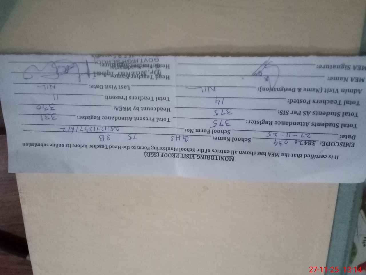 | Attendance Register | Head Teacher | MEA with School | Visit Proof |