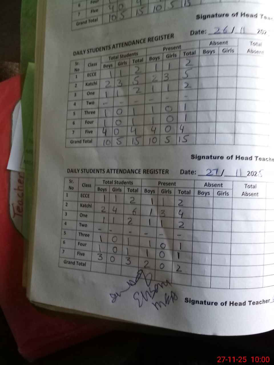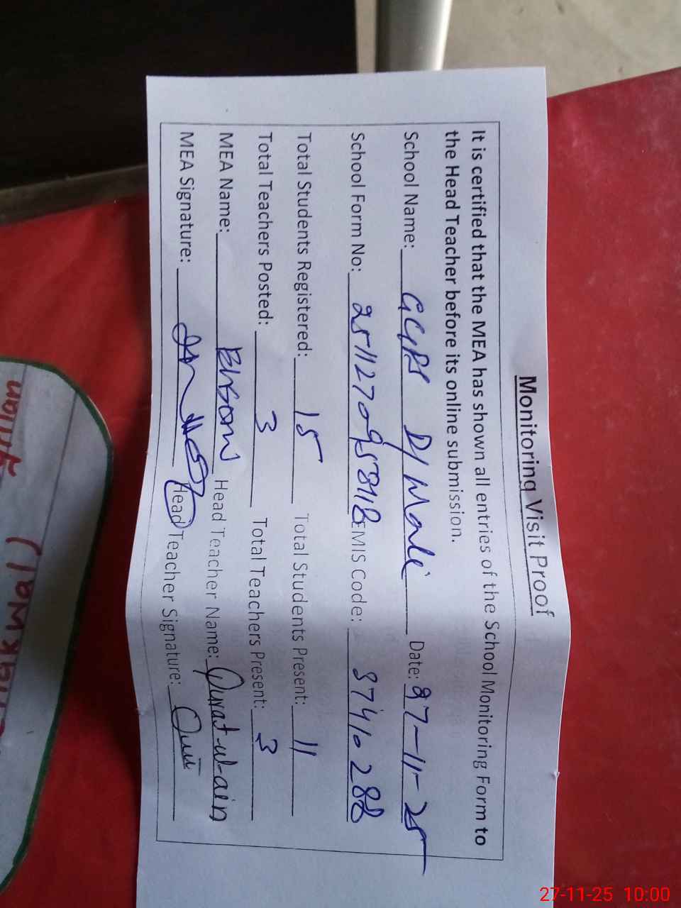 | Attendance Register | Head Teacher | MEA with School | Visit Proof |