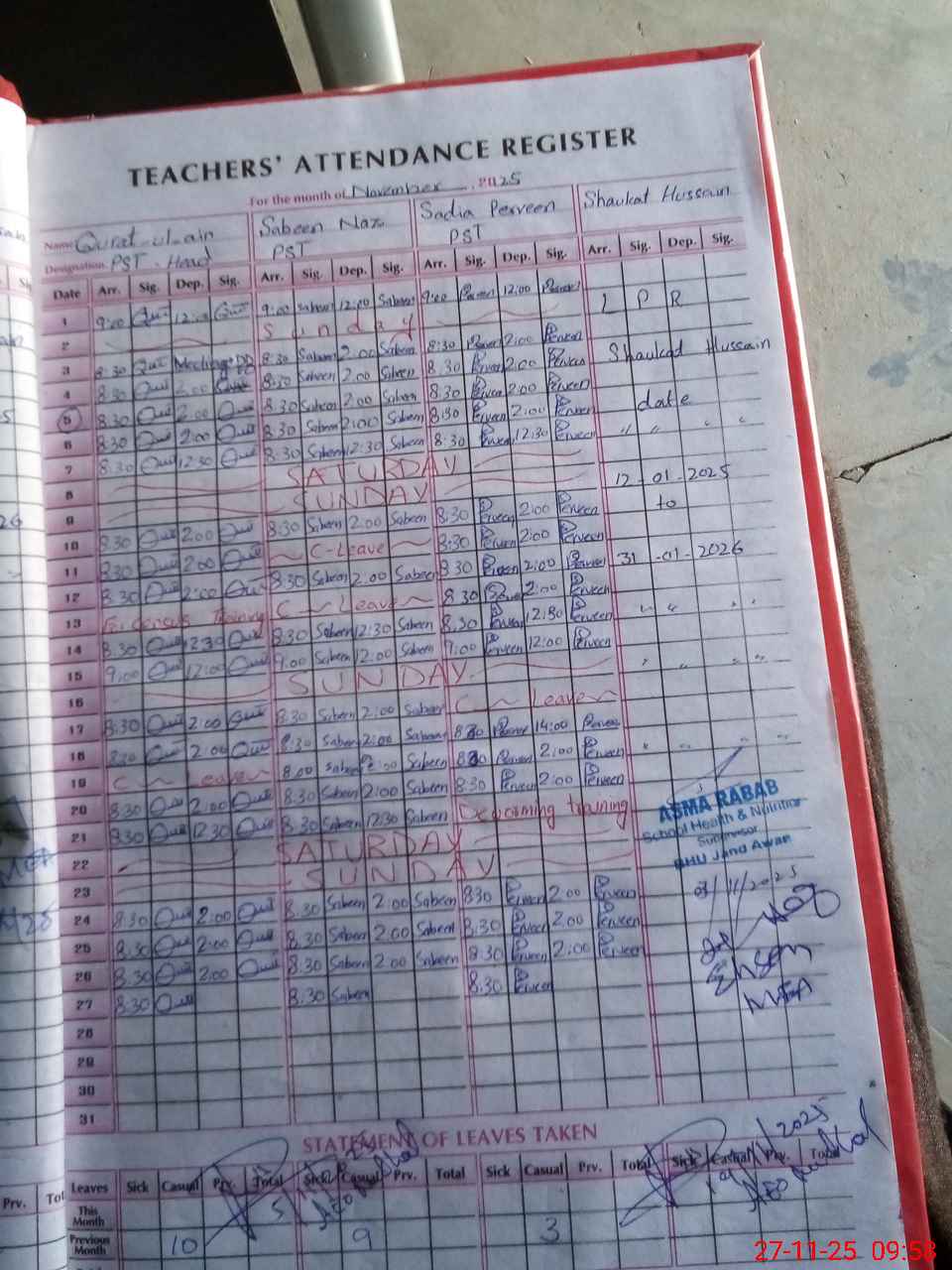 | Leave | Duty | Absent | Maternity | Medical | Ex- Pak |