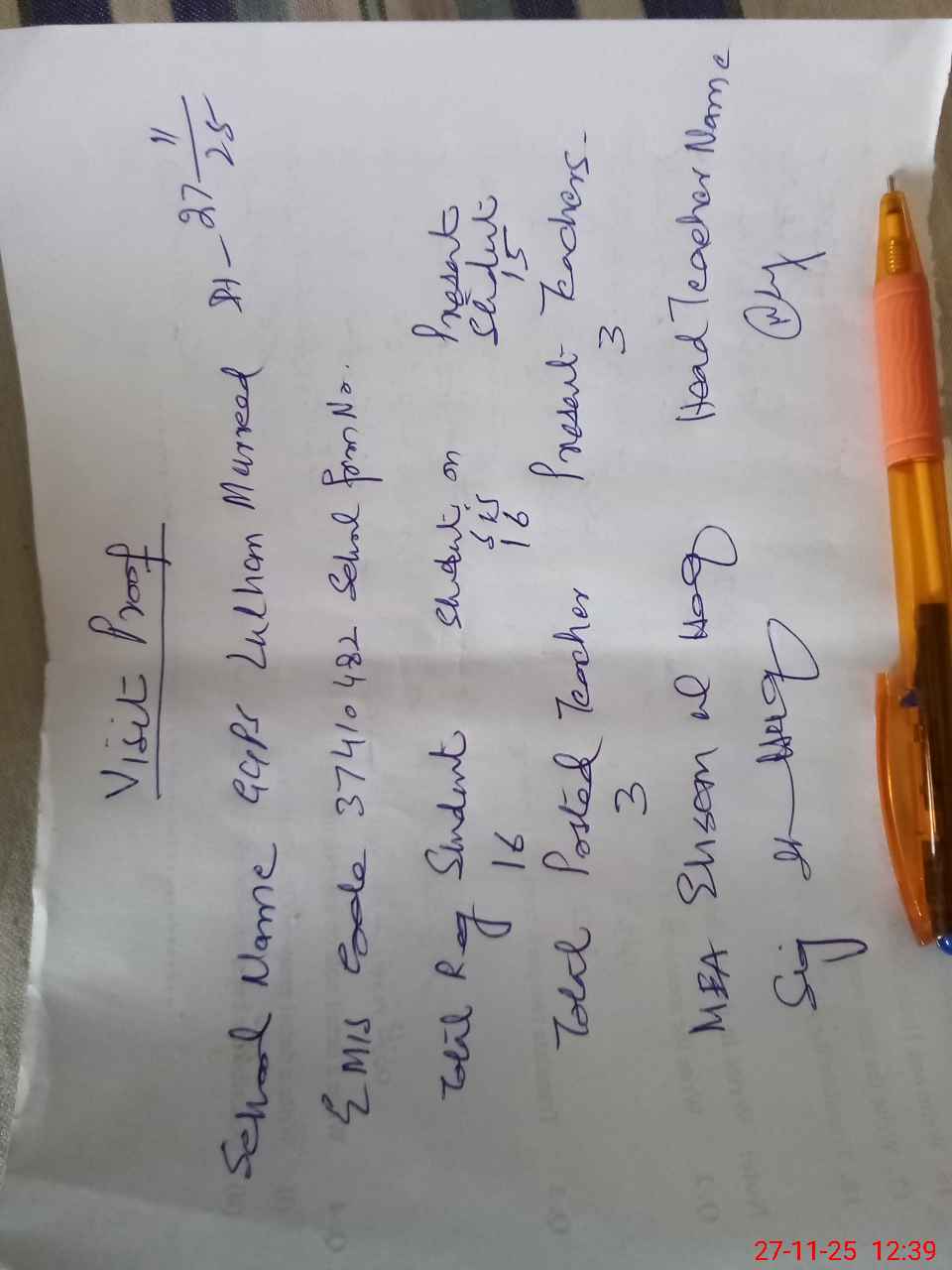 | Attendance Register | Head Teacher | MEA with School | Visit Proof |