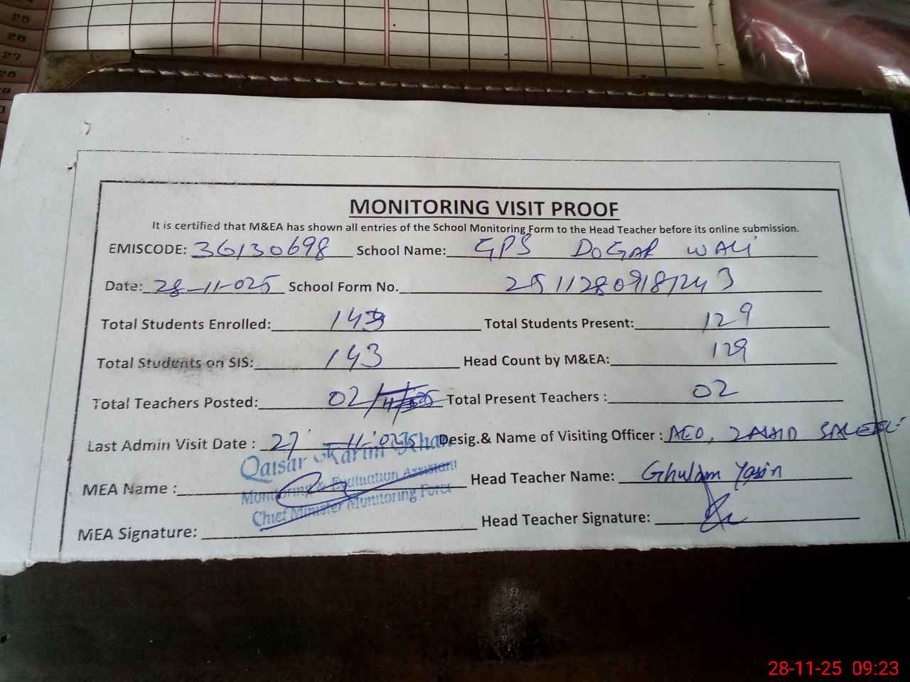 | Attendance Register | Head Teacher | MEA with School | Visit Proof |