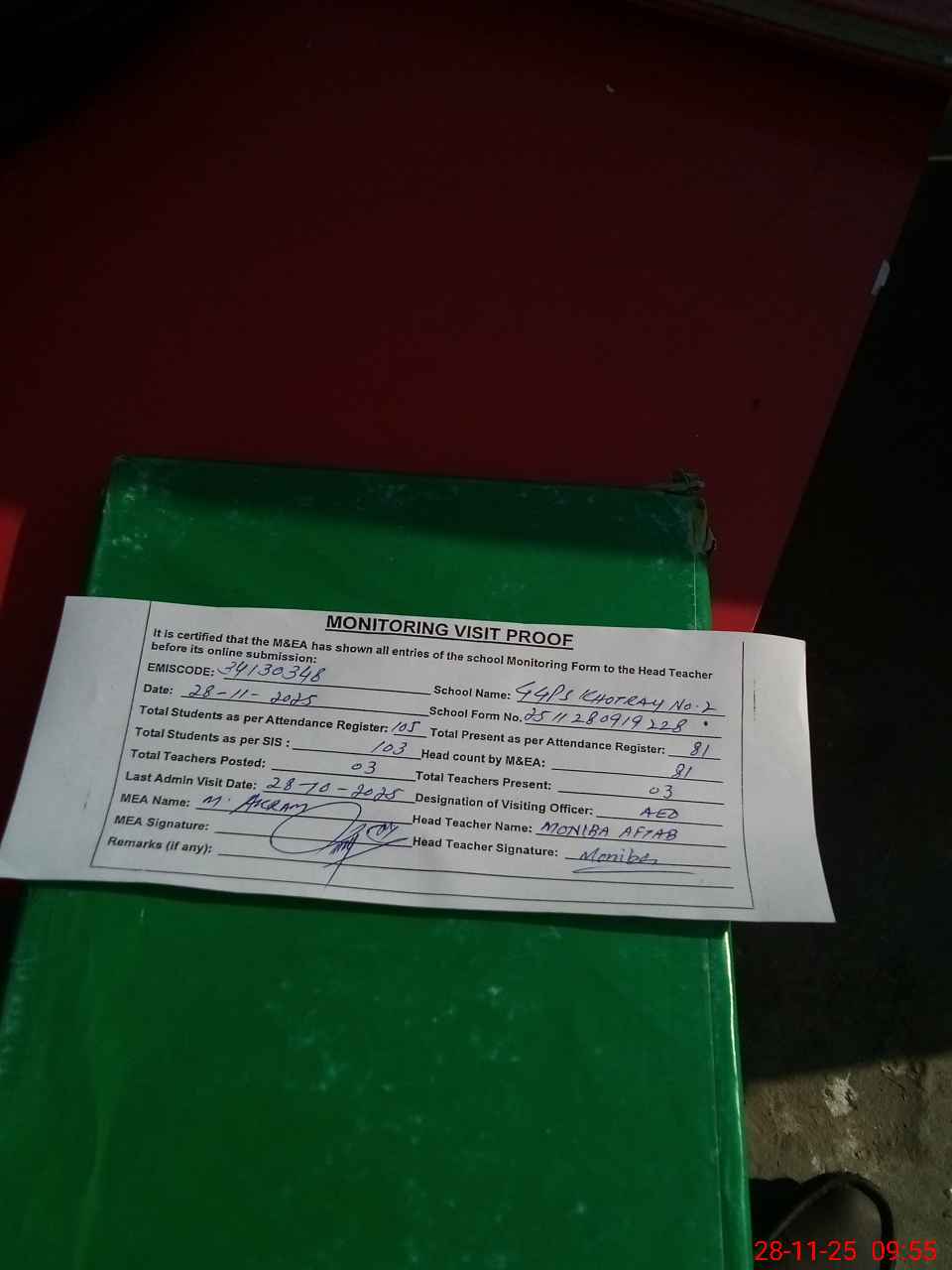 | Attendance Register | Head Teacher | MEA with School | Visit Proof |