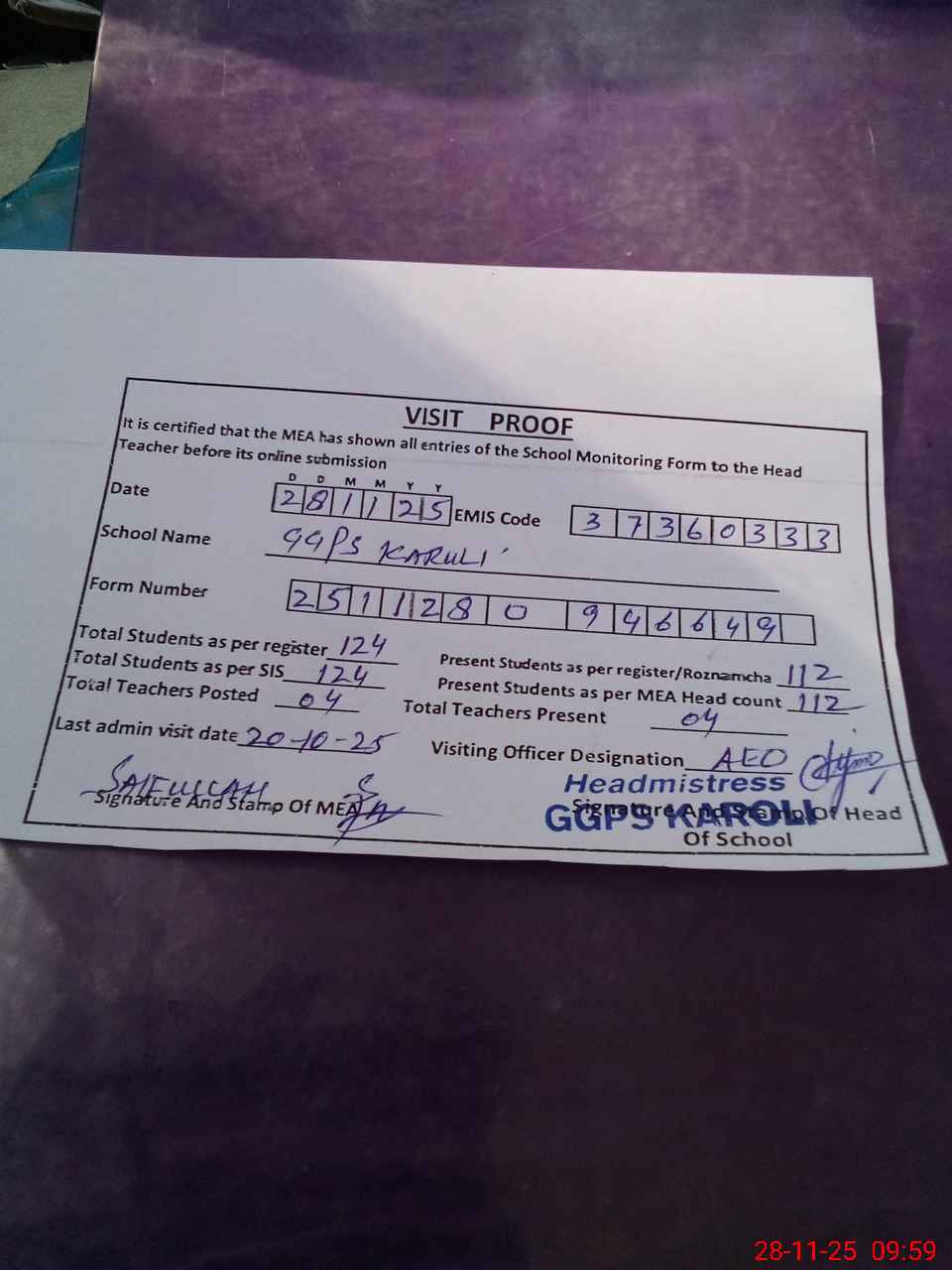 | Attendance Register | Head Teacher | MEA with School | Visit Proof |