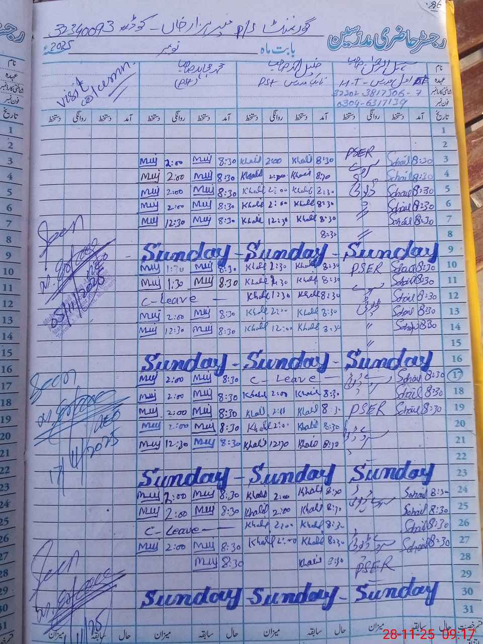 | CNIC | Full Name | Designation | R/C | Absence during last cal. month |
