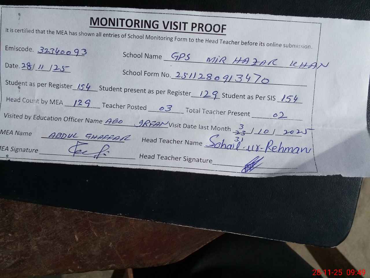 | Attendance Register | Head Teacher | MEA with School | Visit Proof |