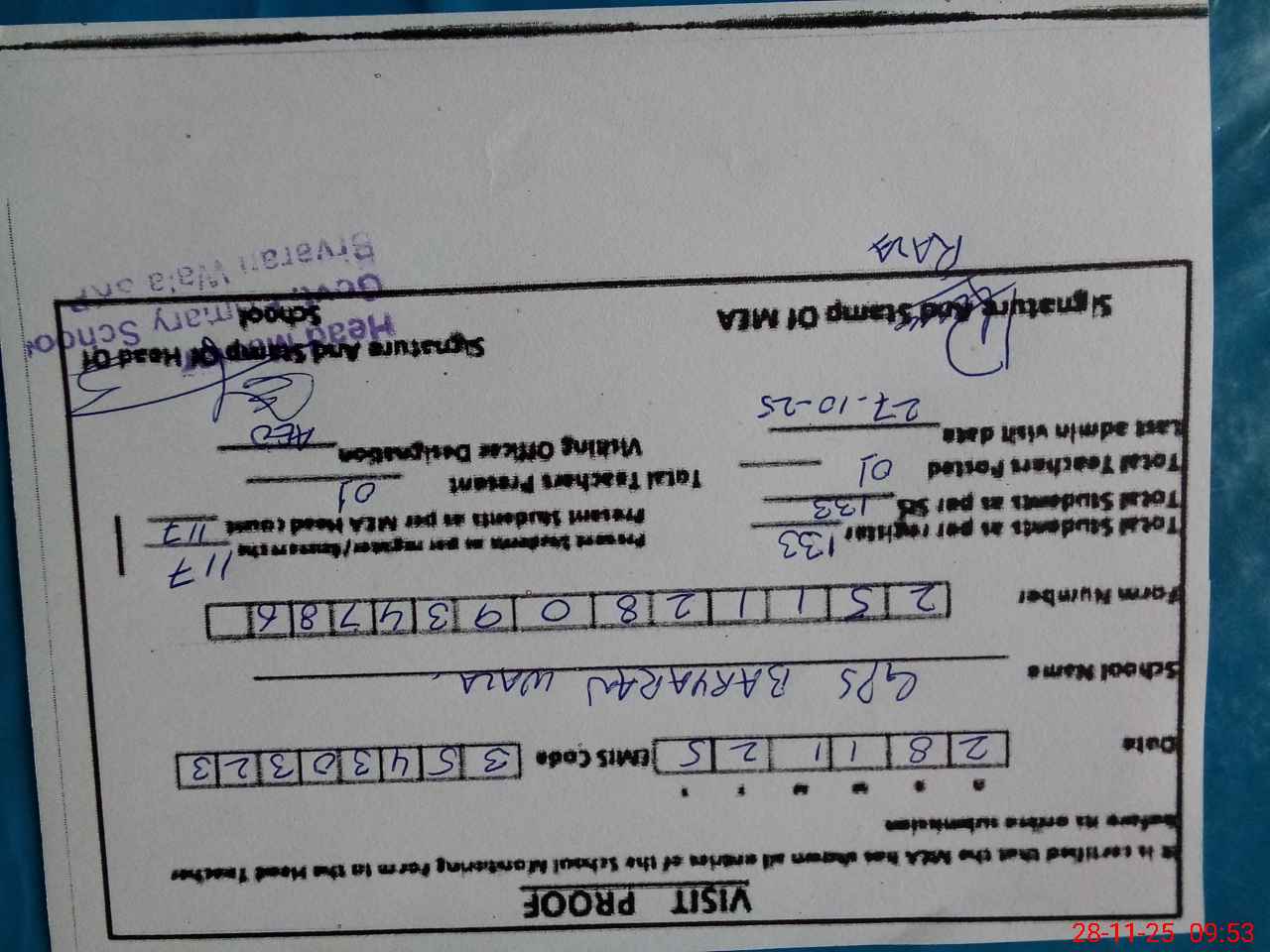 | Attendance Register | Head Teacher | MEA with School | Visit Proof |
