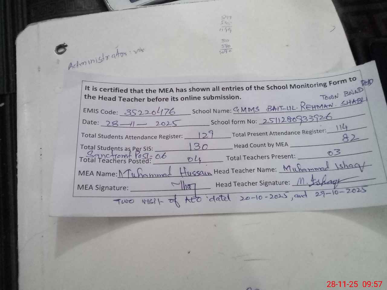 | Attendance Register | Head Teacher | MEA with School | Visit Proof |