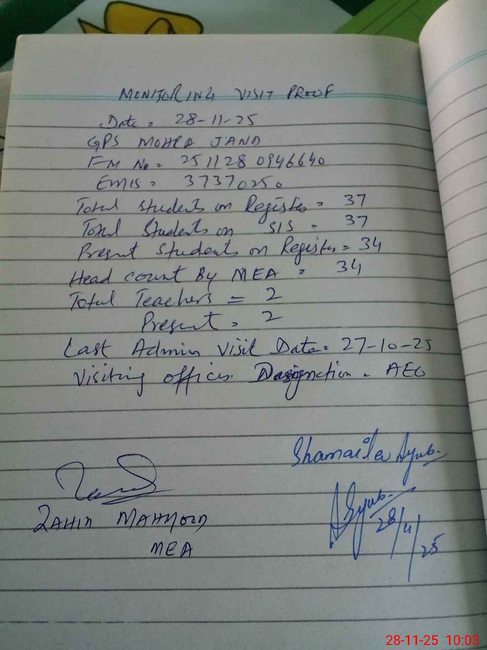 | Attendance Register | Head Teacher | MEA with School | Visit Proof |