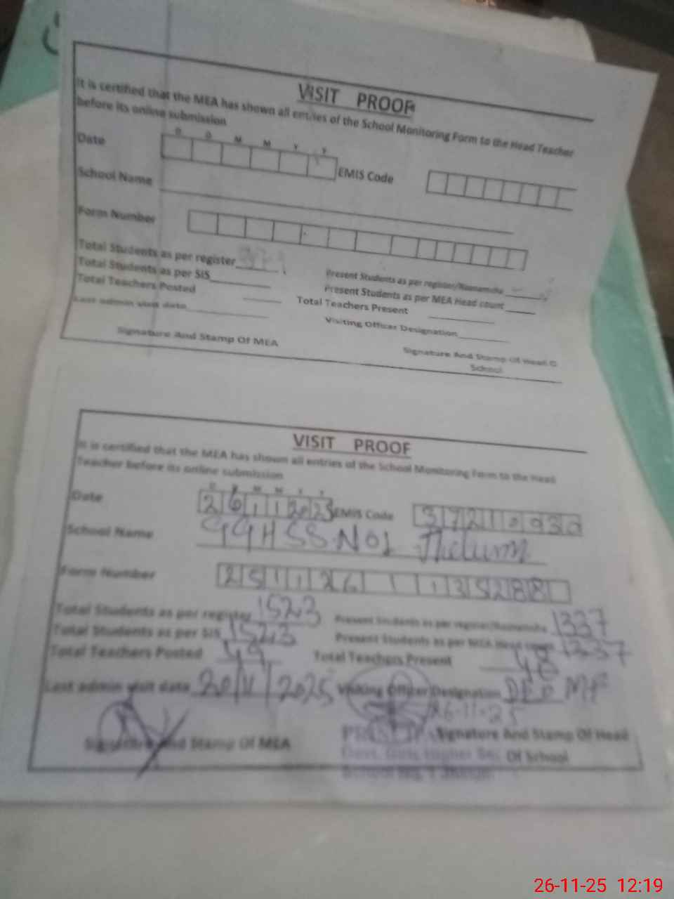 | Attendance Register | Head Teacher | MEA with School | Visit Proof |