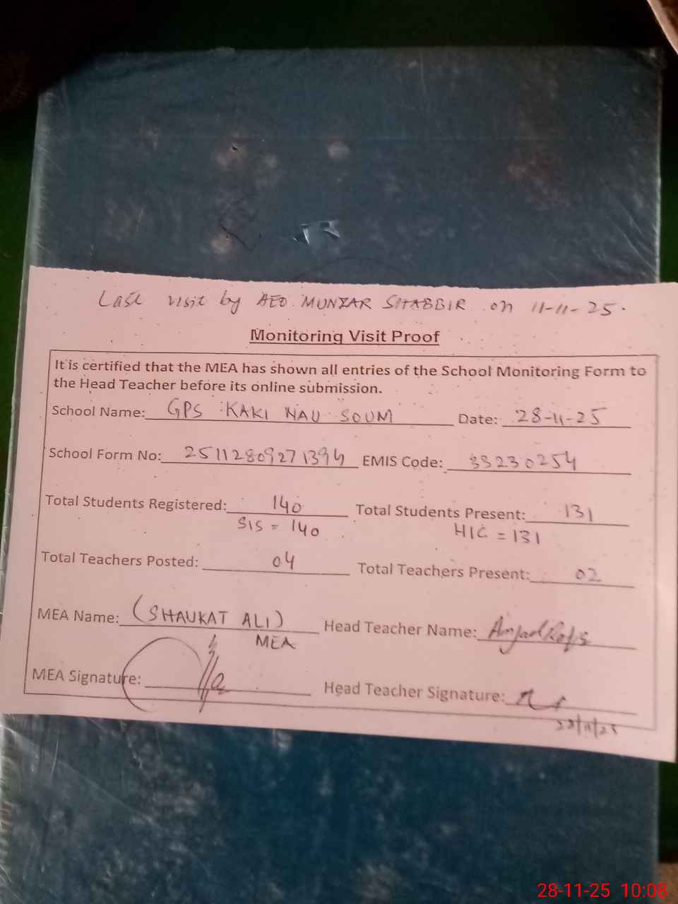| Attendance Register | Head Teacher | MEA with School | Visit Proof |