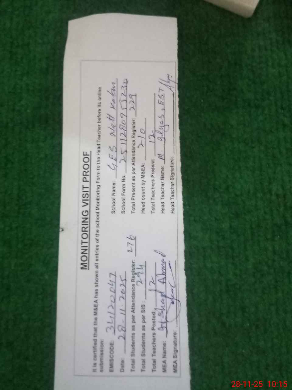| Attendance Register | Head Teacher | MEA with School | Visit Proof |