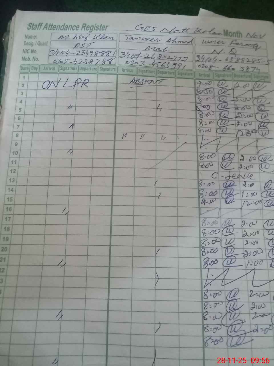 | CNIC | Full Name | Designation | R/C | Absence during last cal. month |