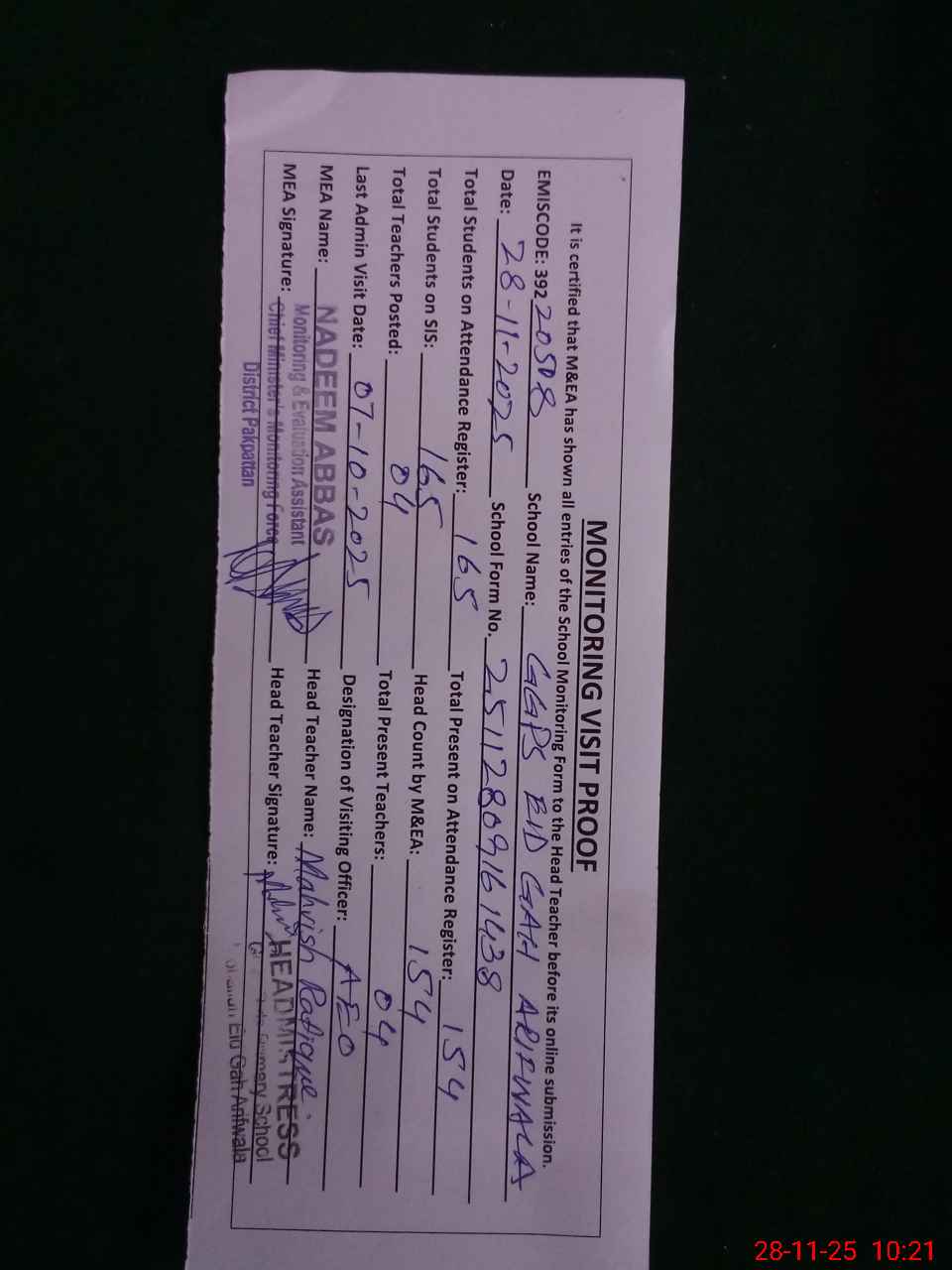 | Attendance Register | Head Teacher | MEA with School | Visit Proof |