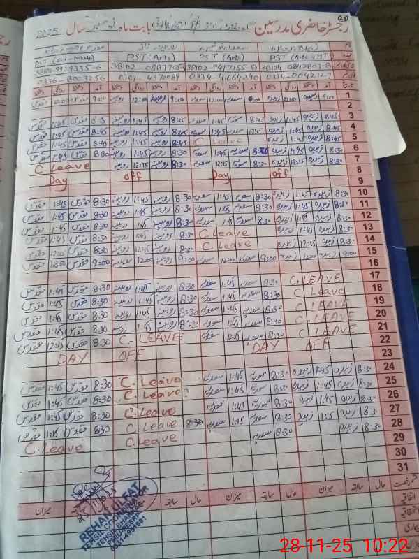 | CNIC | Full Name | Designation | R/C | Absence During Last Calender Month |
