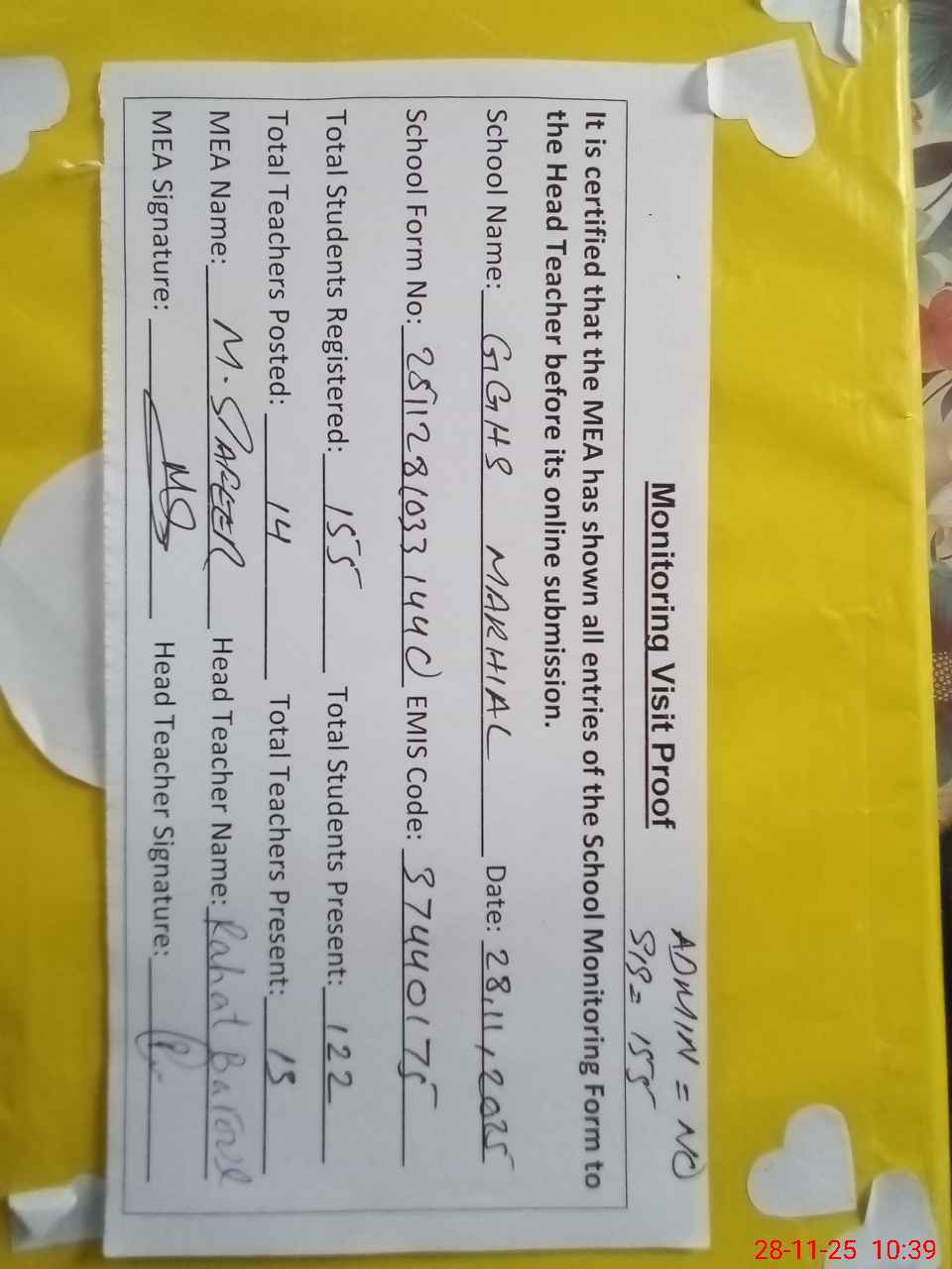 | Attendance Register | Head Teacher | MEA with School | Visit Proof |