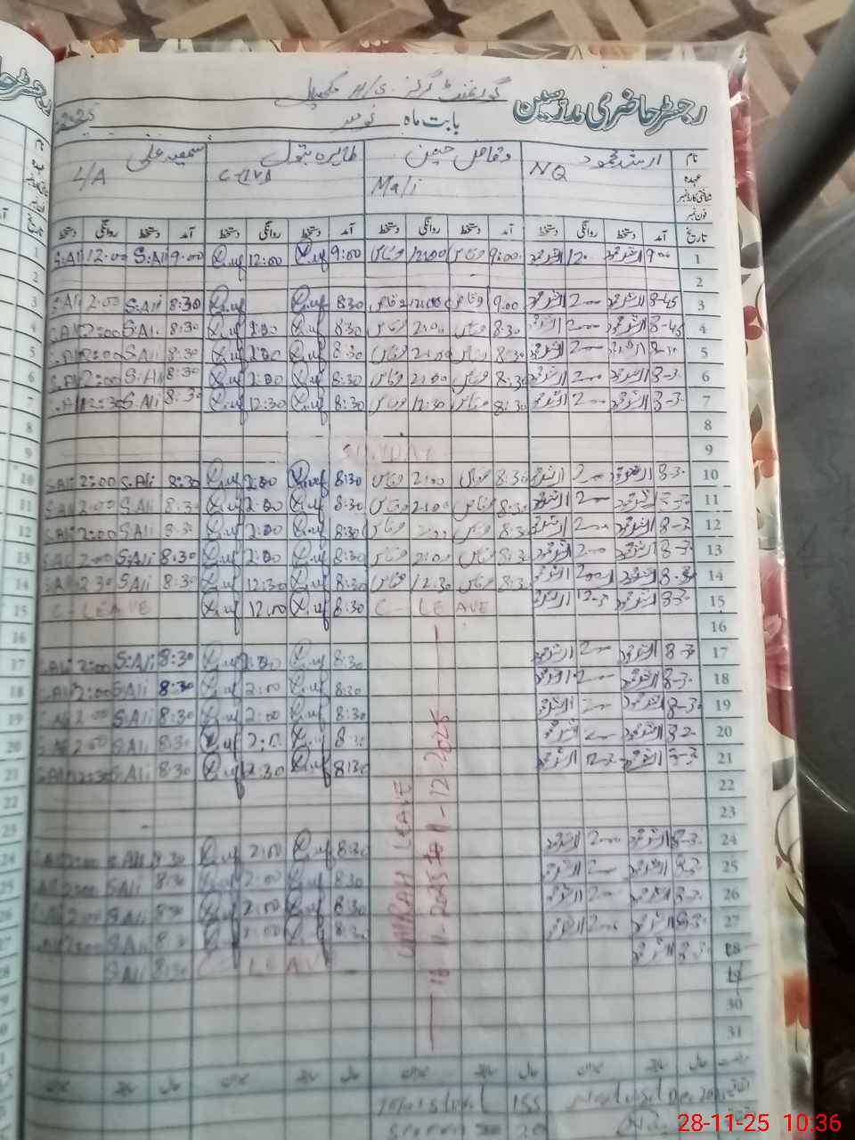 | CNIC | Full Name | Designation | R/C | Absence During Last Calender Month |