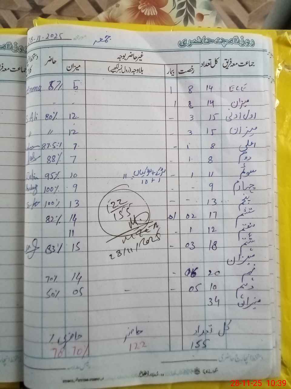 | Total Students Present | 0 | 5 | 7 | 7 | 10 | 9 | 12 | 14 | 11 | 15 | 16 | 5 | 122 | |||