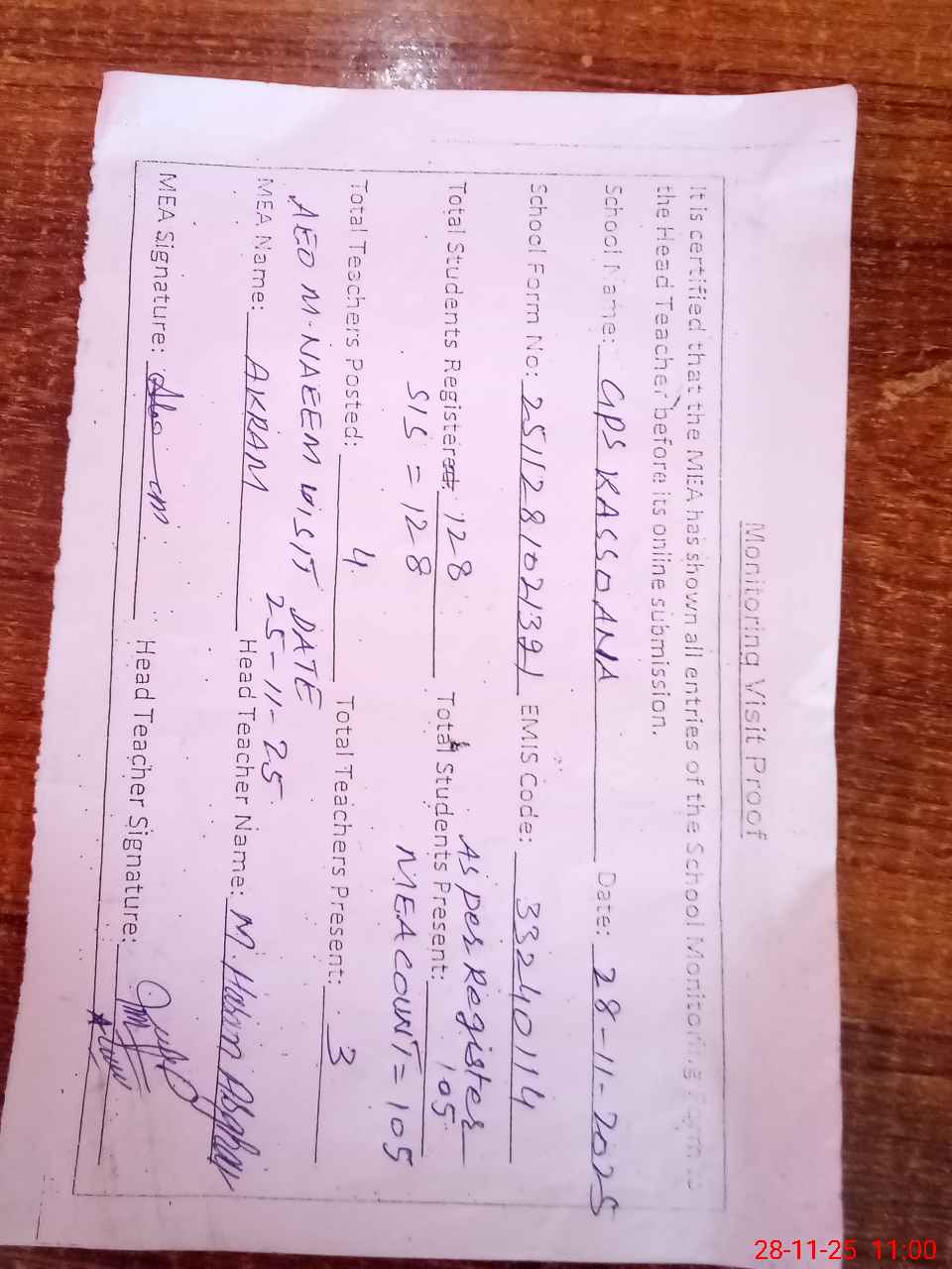 | Attendance Register | Head Teacher | MEA with School | Visit Proof |
