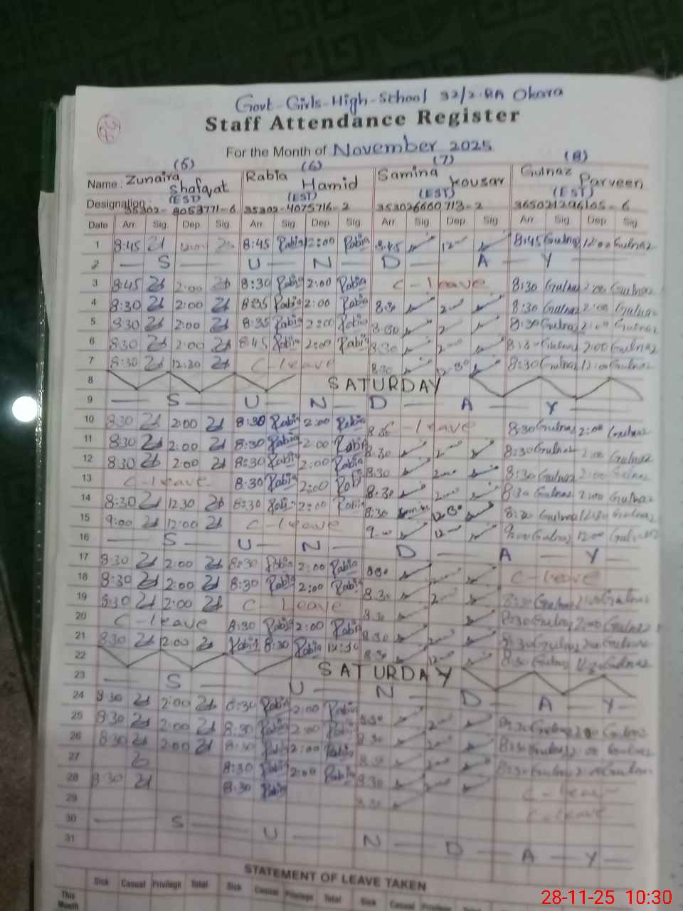 | Remarks (Use Separate Page if Required): Last admin visit by DEO Sec Okara on 15 October 2025 02 wash room not functional blocked | |||||