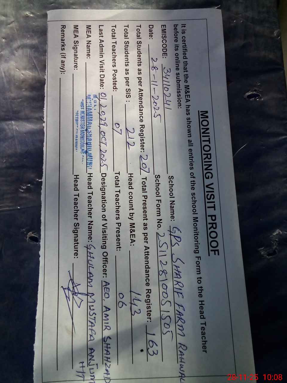 | EMIS Code: 34110241 | Name of School: GPS SHARIF FARM RAHWALI | |||