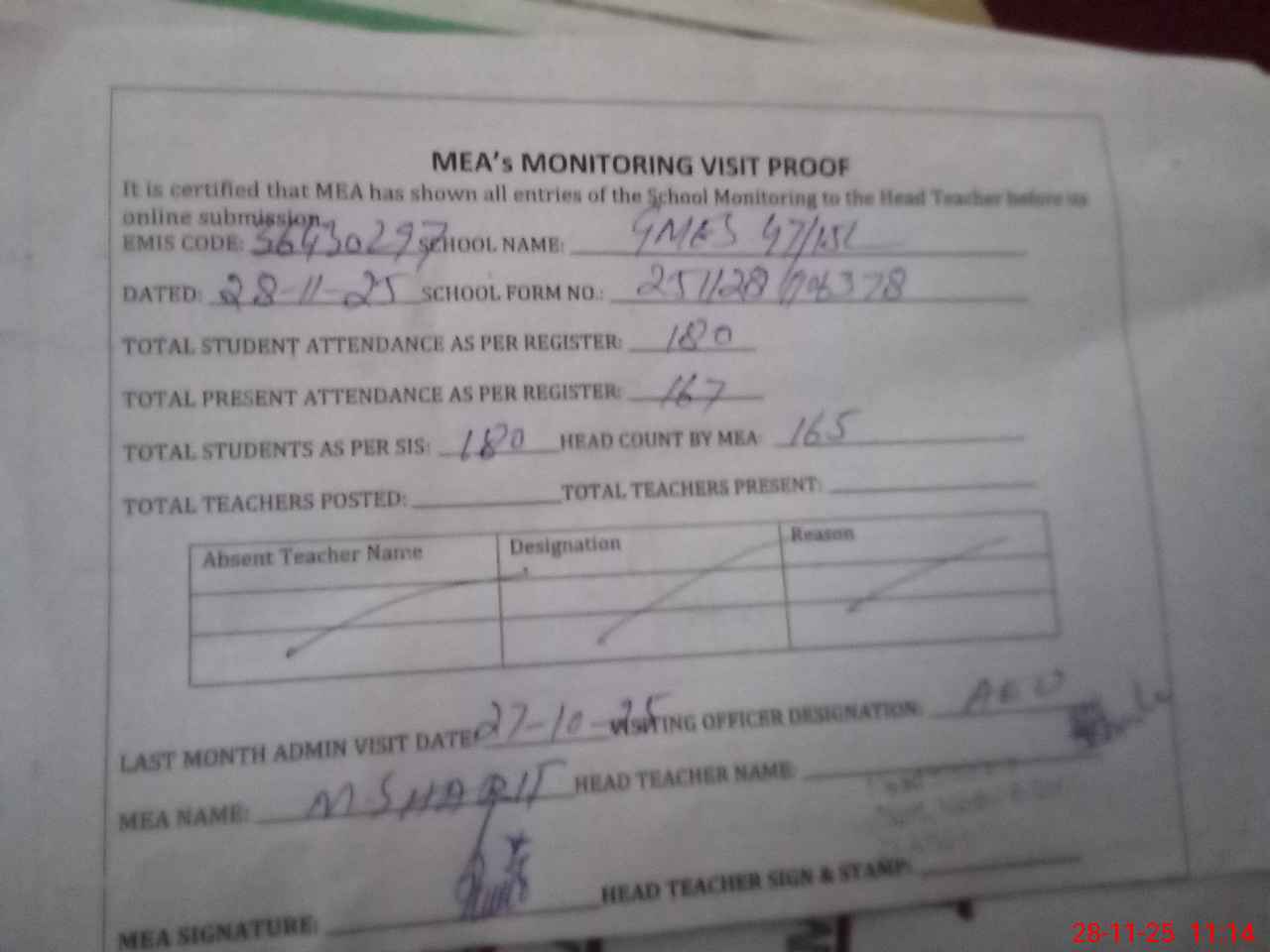 | Attendance Register | Head Teacher | MEA with School | Visit Proof |