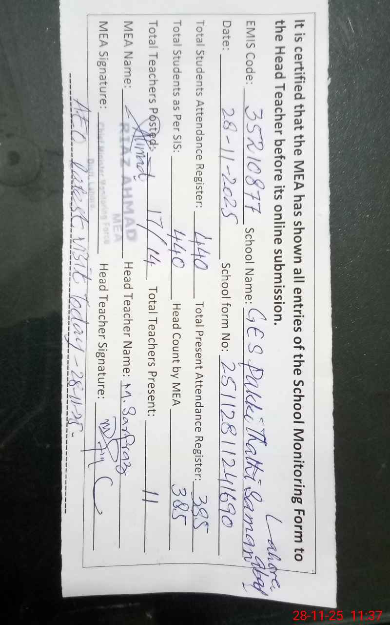 | Attendance Register | Head Teacher | MEA with School | Visit Proof |