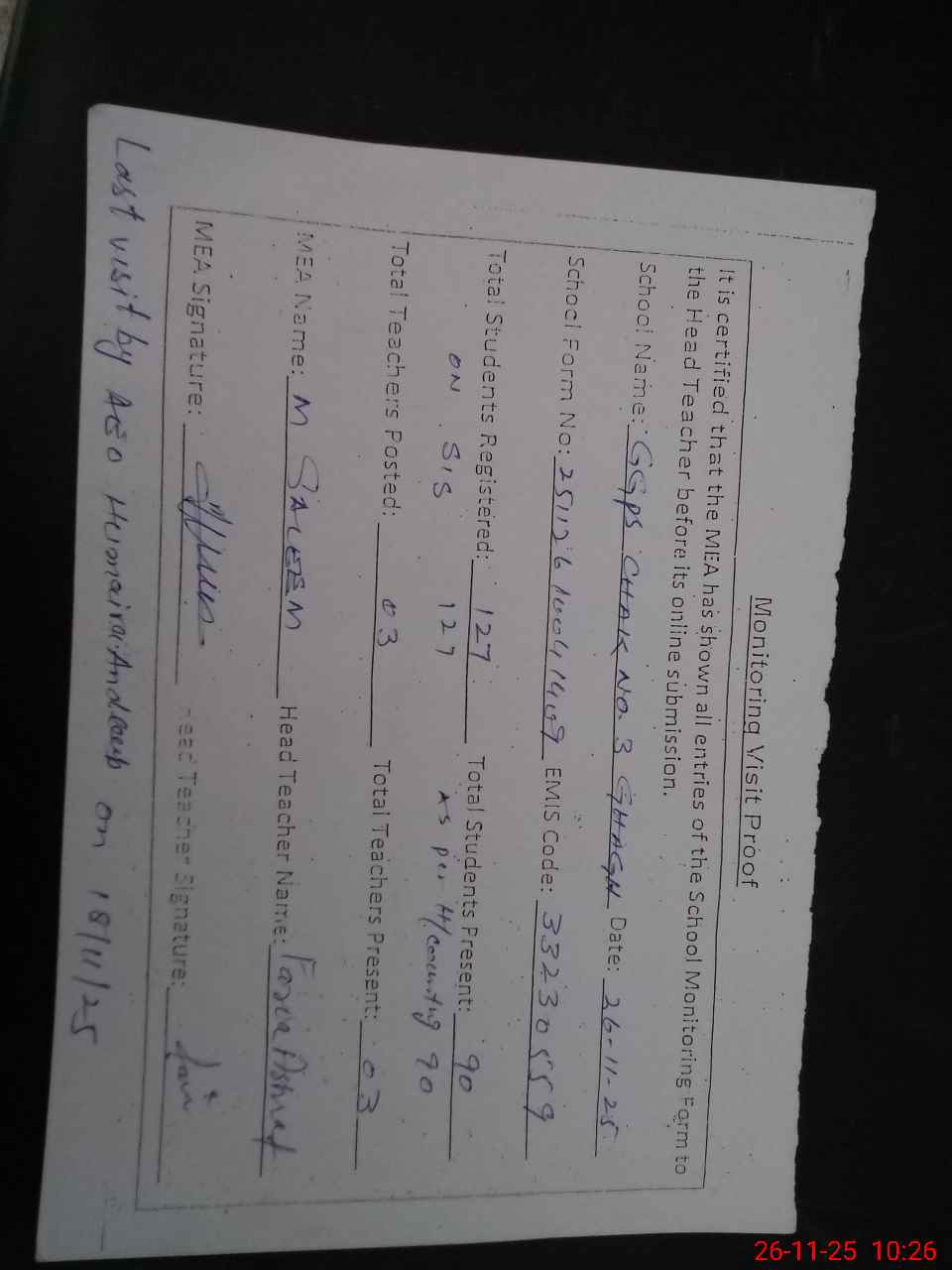 | Attendance Register | Head Teacher | MEA with School | Visit Proof |