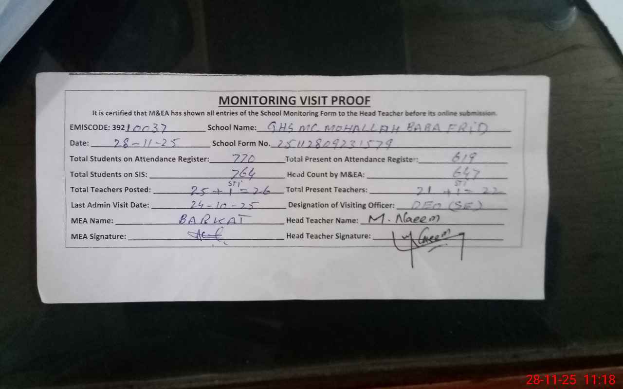 | EMIS Code: 39210037 | Name of School: GHS MC MOHALLAH BABA FARID | |||