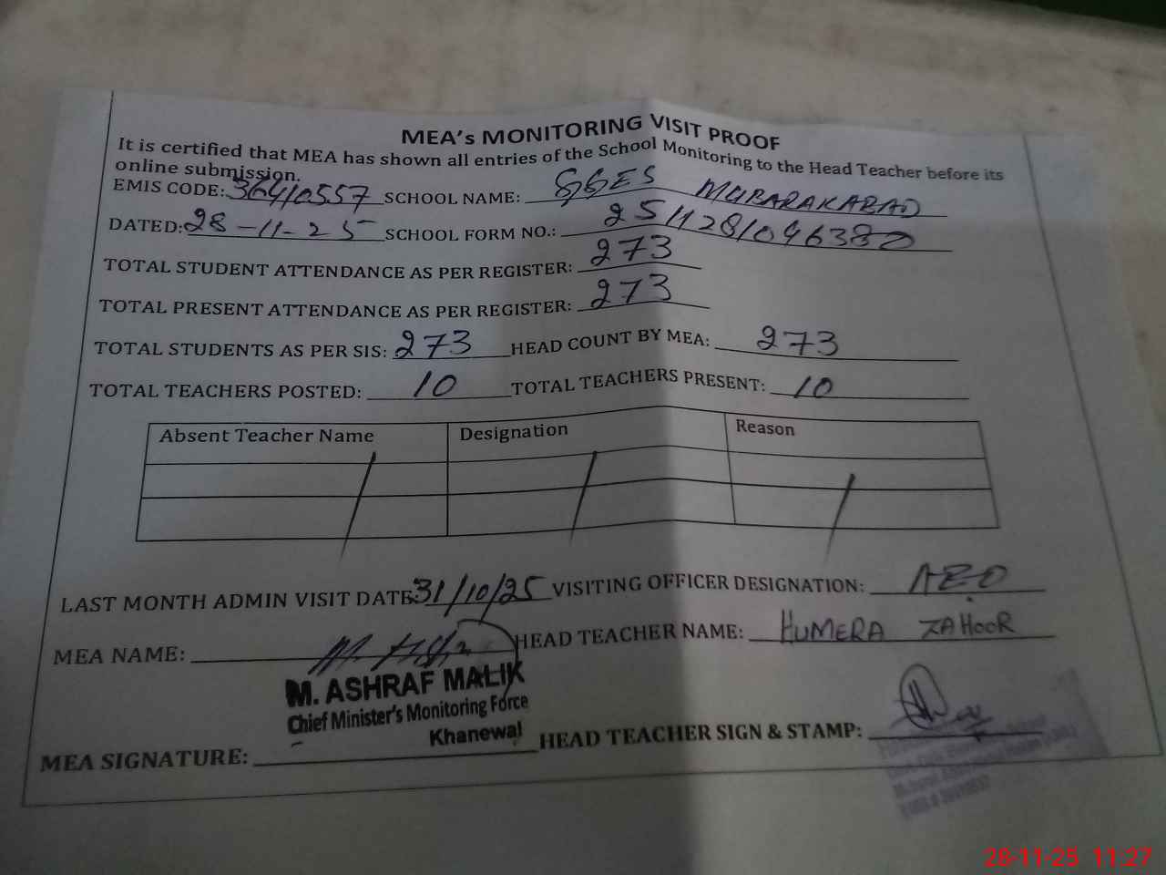 | Attendance Register | Head Teacher | MEA with School | Visit Proof |