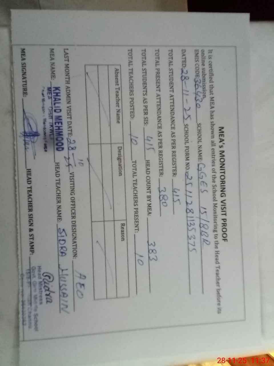 | Attendance Register | Head Teacher | MEA with School | Visit Proof |