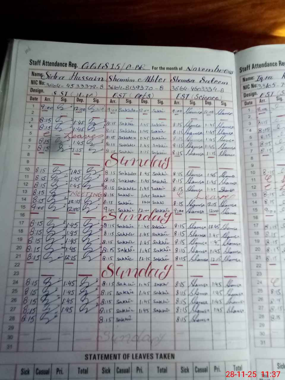 | CNIC | Full Name | Designation | R/C | Absence During Last Calender Month |