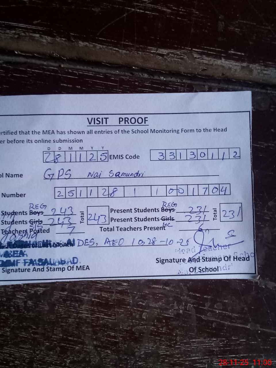 | Attendance Register | Head Teacher | MEA with School | Visit Proof |