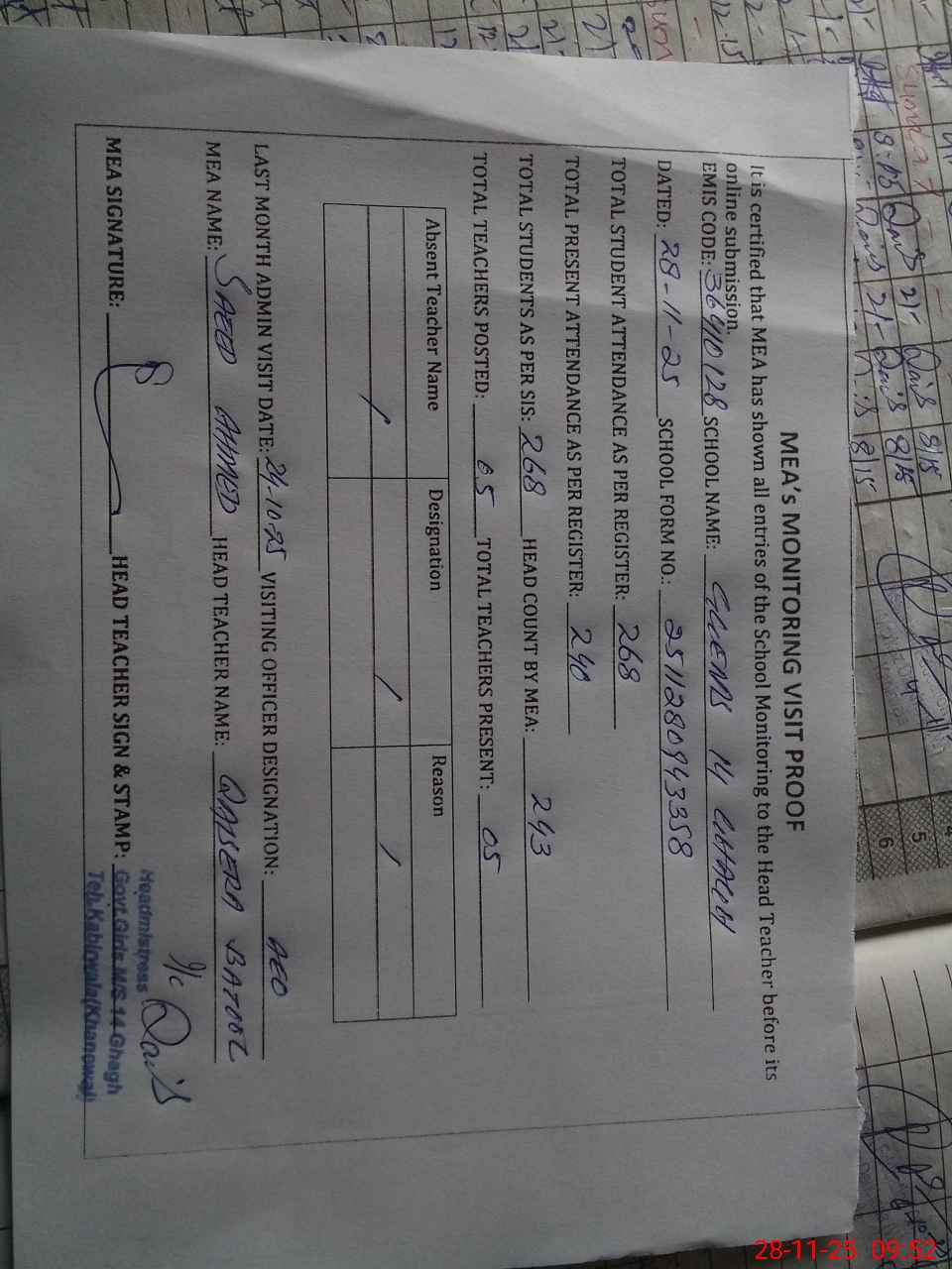 | EMIS Code: 36410128 | Name of School: GMES 14 GHAGH, ABDUL HAKIM | |||
