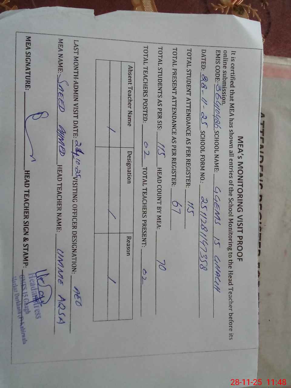 | Attendance Register | Head Teacher | MEA with School | Visit Proof |