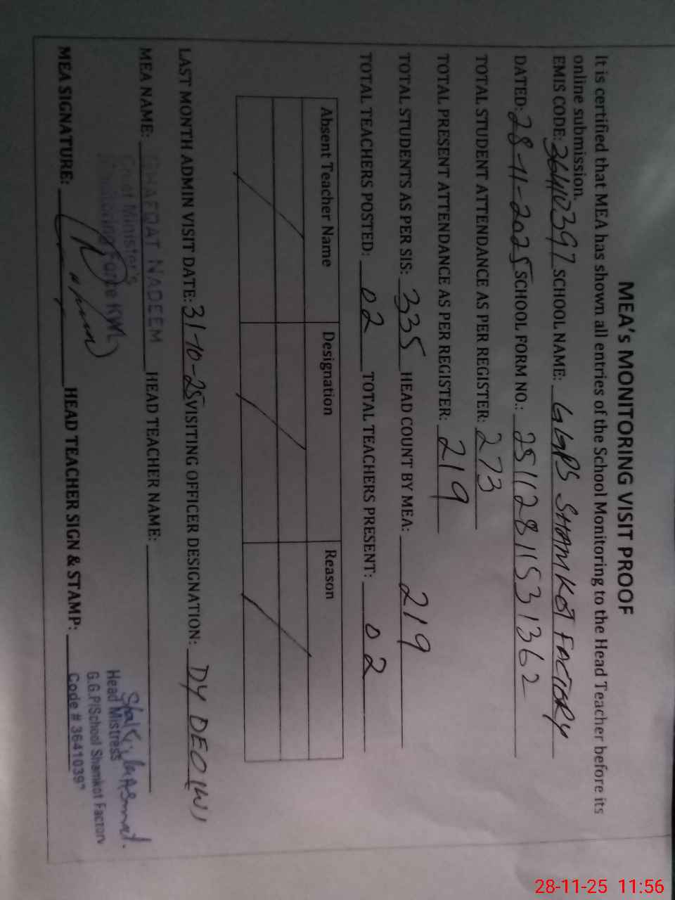 | Attendance Register | Head Teacher | MEA with School | Visit Proof |