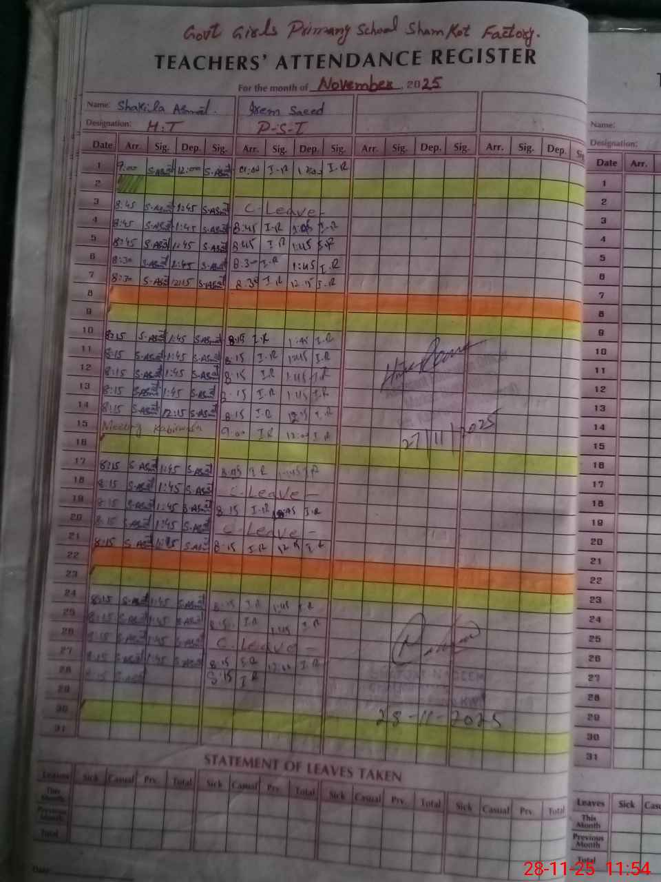 | CNIC | Full Name | Designation | R/C | Absence During Last Calender Month |