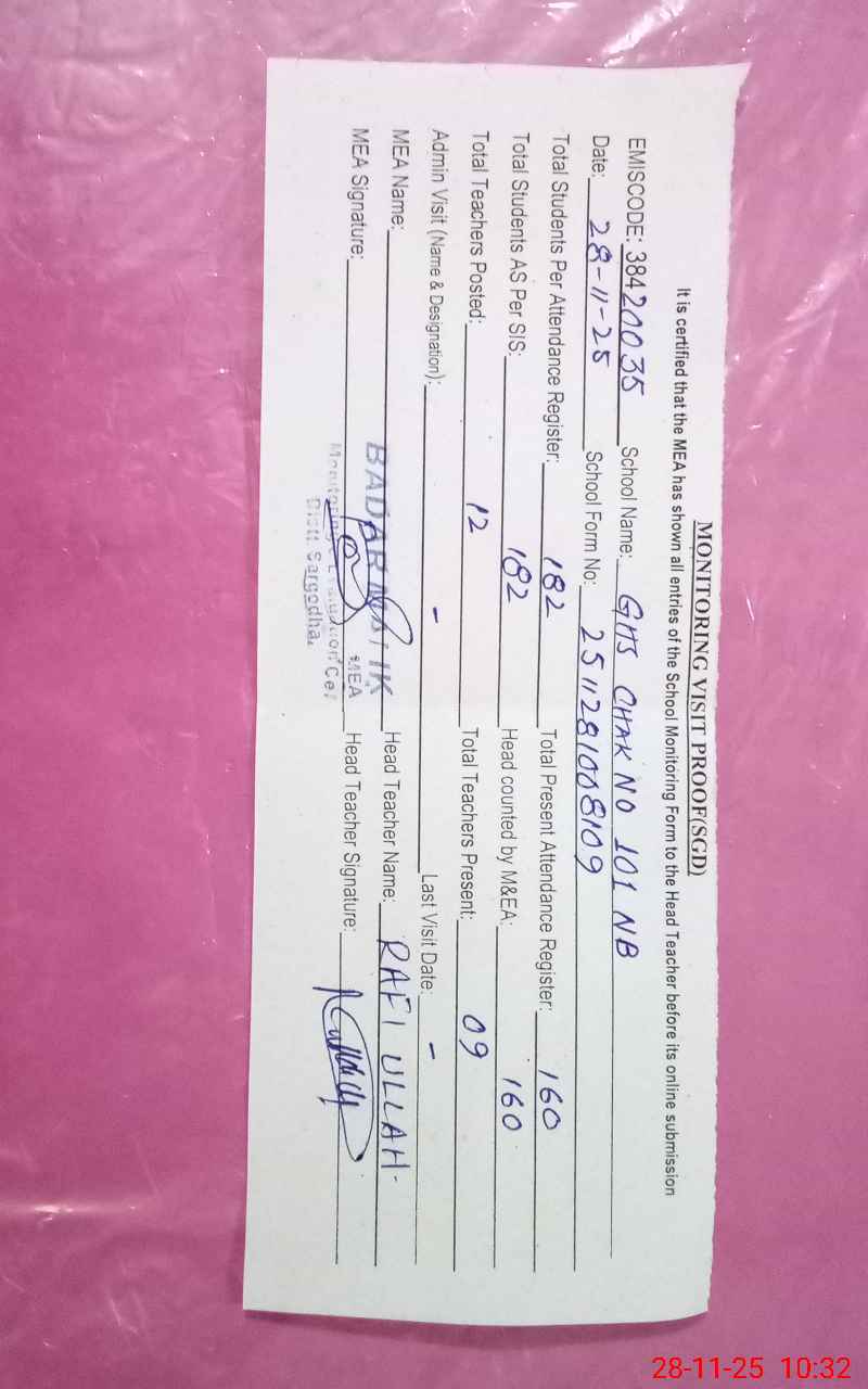 | EMIS Code: 38420035 | Name of School: GHS CHAK NO.101 NB SGD | |||