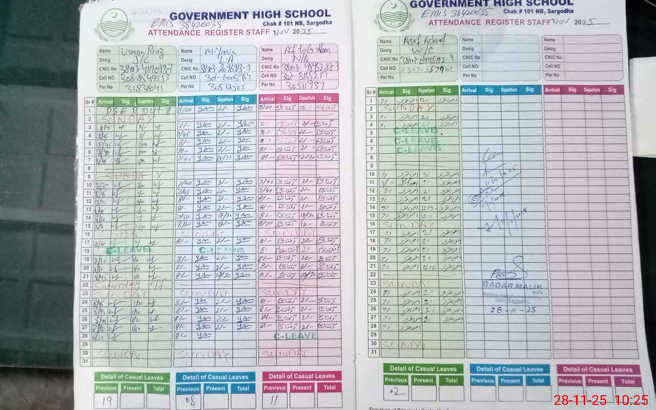 | CNIC | Full Name | Designation | R/C | Absence During Last Calender Month |