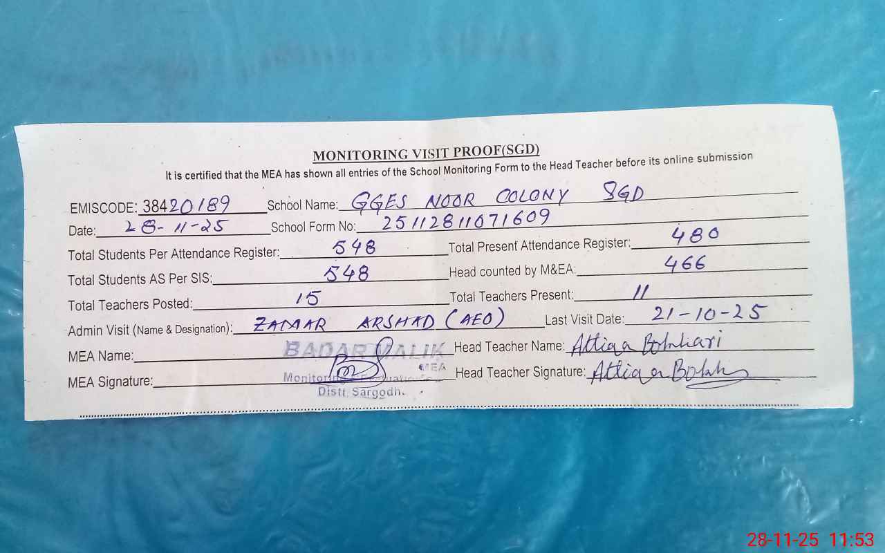 | EMIS Code: 38420189 | Name of School: GGES NOOR COLONY SARGODHA | |||