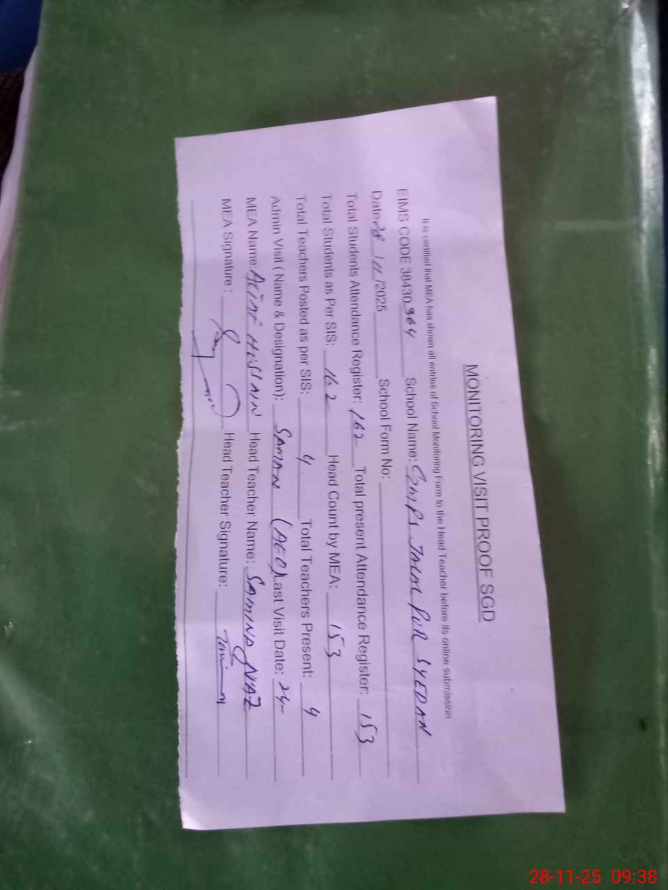 | Attendance Register | Head Teacher | MEA with School | Visit Proof |