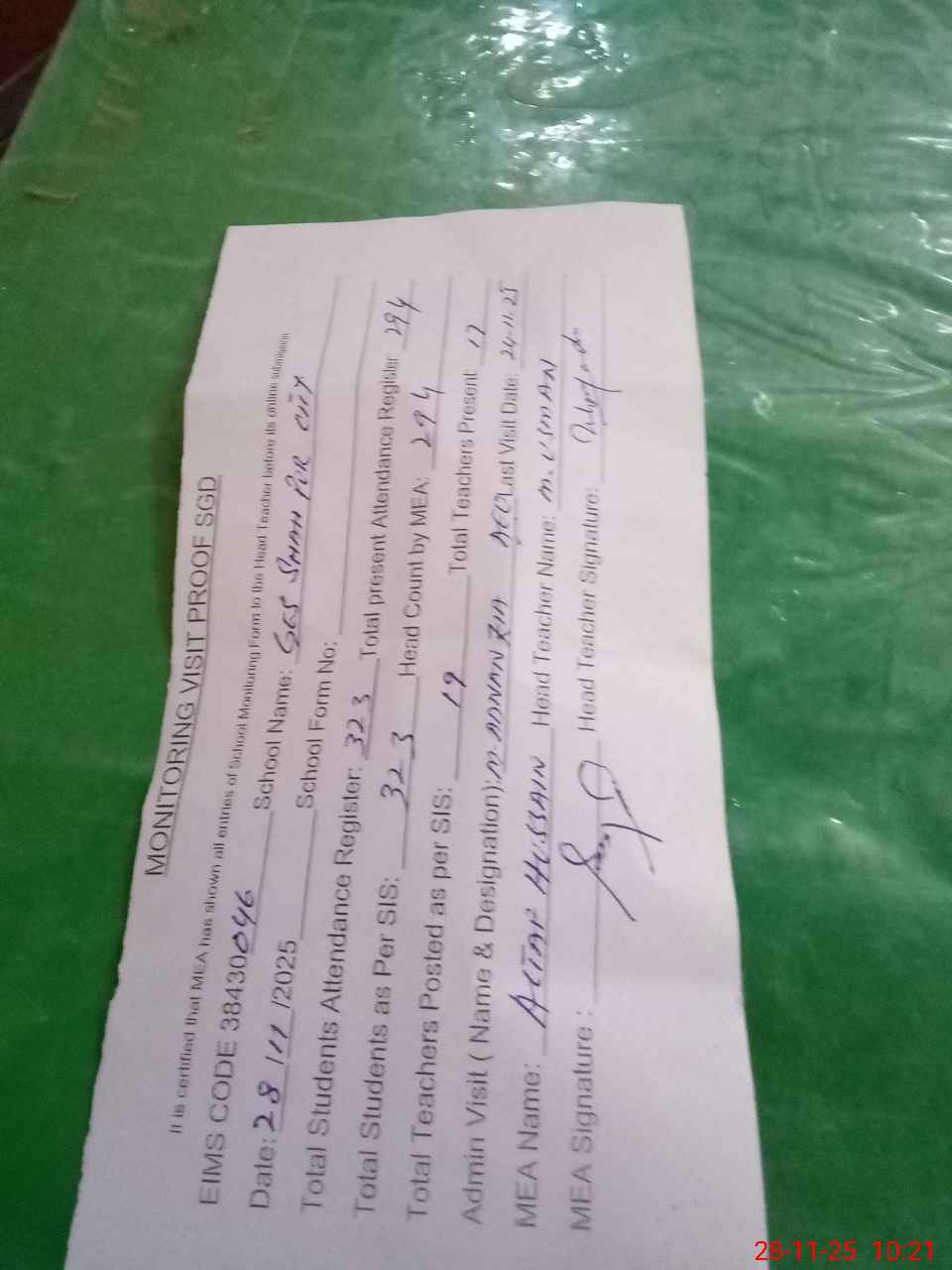 | Attendance Register | Head Teacher | MEA with School | Visit Proof |