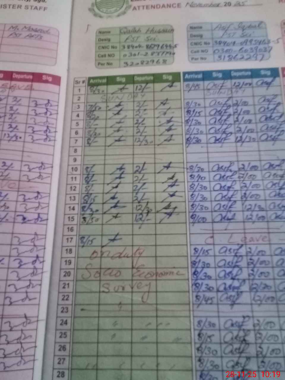 | CNIC | Full Name | Designation | R/C | Absence During Last Calender Month |