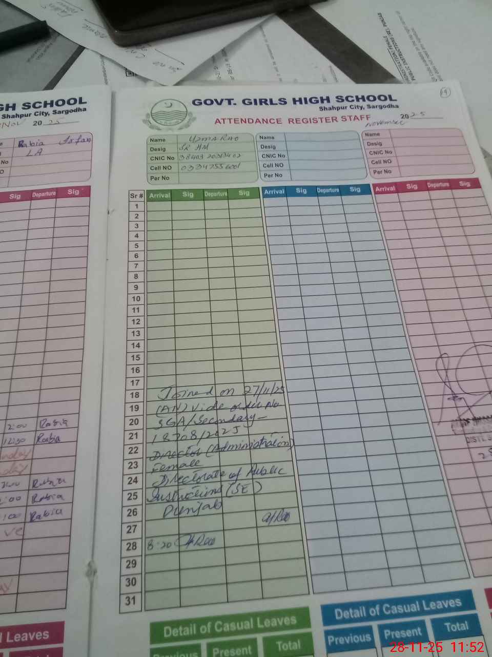 | CNIC | Full Name | Designation | R/C | Absence During Last Calender Month |
