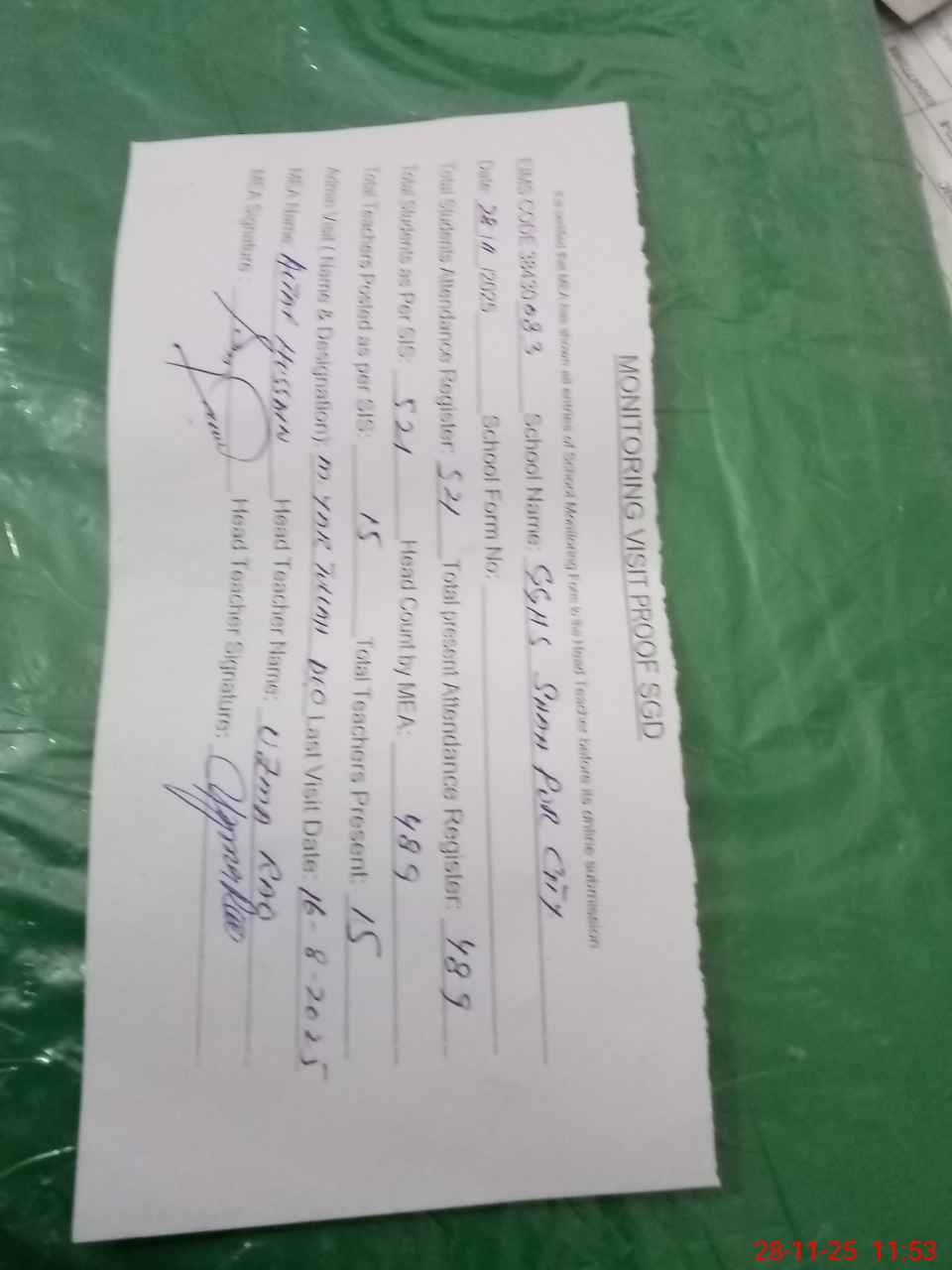 | Attendance Register | Head Teacher | MEA with School | Visit Proof |