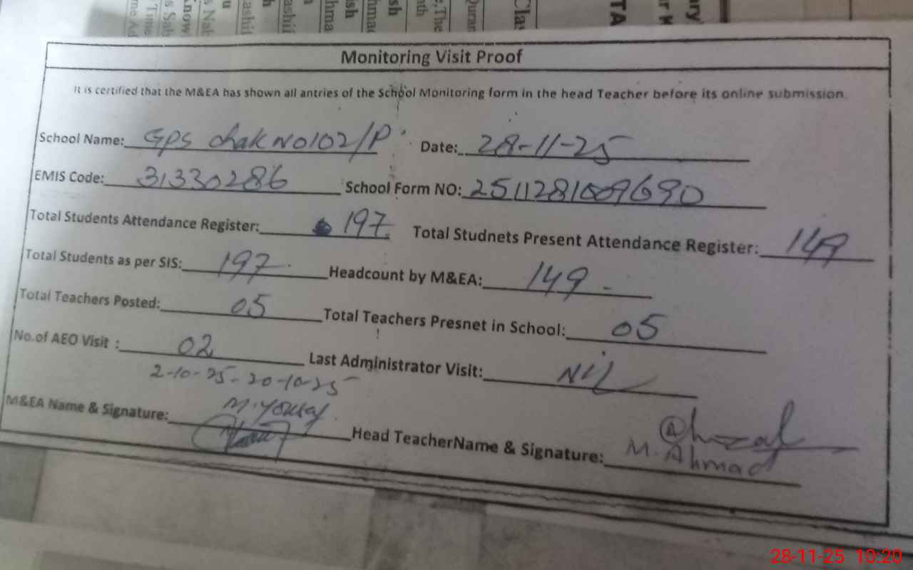 | EMIS Code: 31330286 | Name of School: GPS CHAK 102/P | |||
